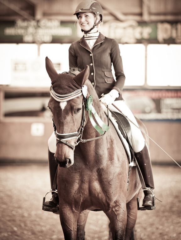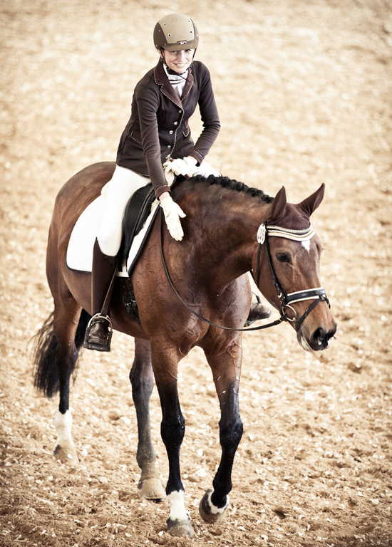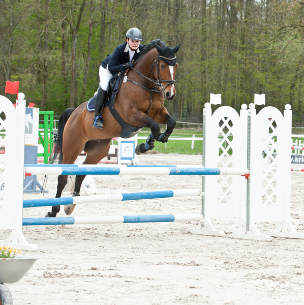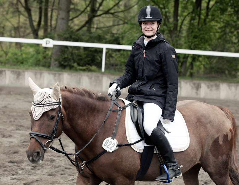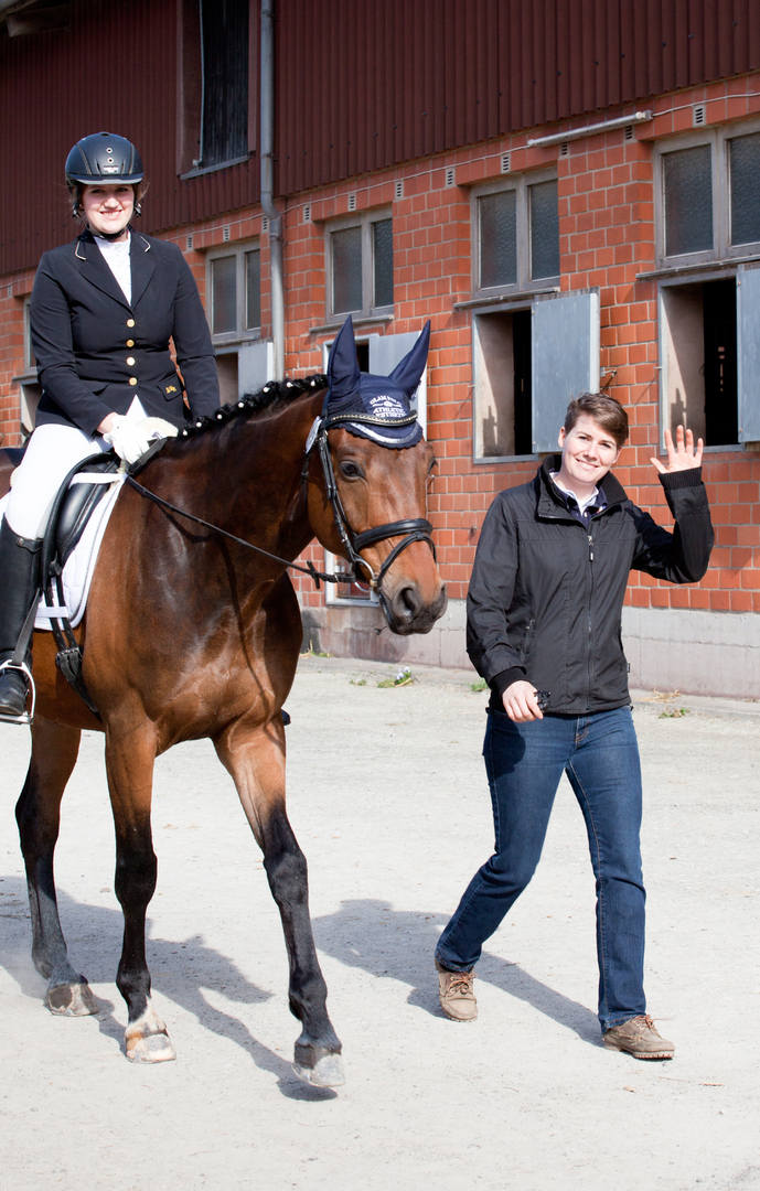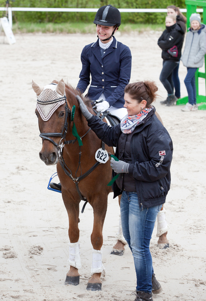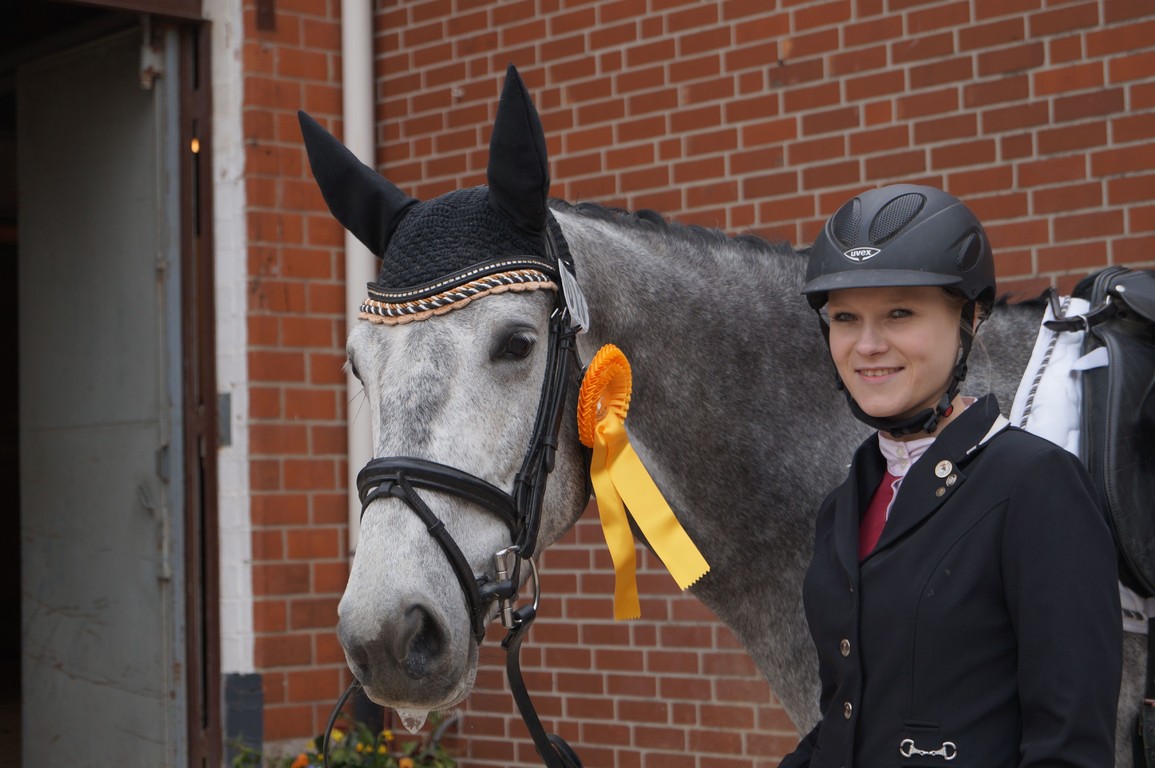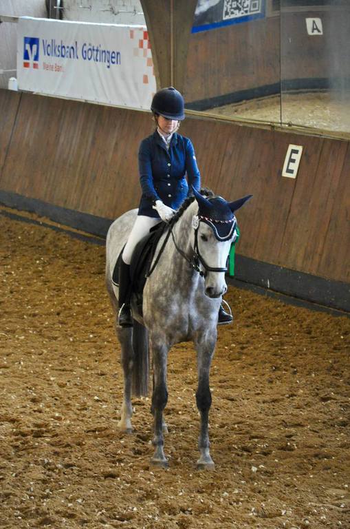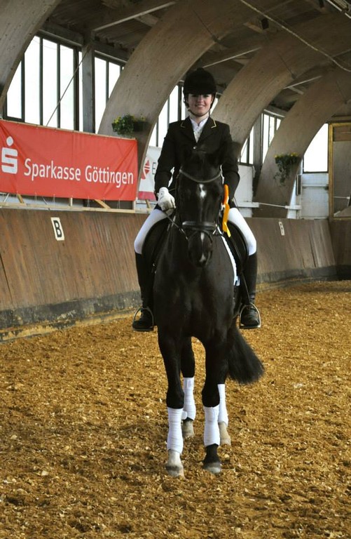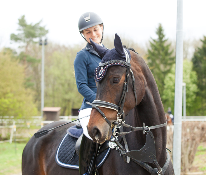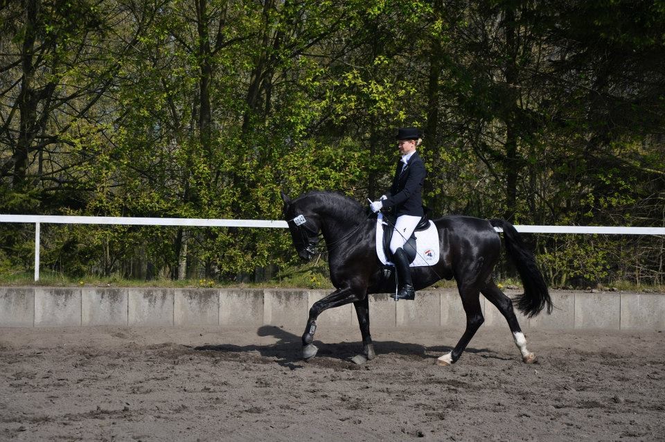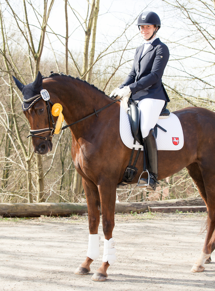 Sie war an diesem Wochenende nicht aufzuhalten: Carolin Miserre holte sich gleich vier goldene Schleifen. Mit Severino Hit gewann sie am Samstag die Dressurprüfung Kl. L-Kandare und die M*-Dressur. Am Sonntagmorgen führte sie ihre Siegesserie fort und sicherte sich mit ihrem zweiten Pferd Don Ricardo den ersten Platz in der M**-Dressur. Dementsprechend waren die Erwartungen der Zuschauer groß, als die Reiterin vom RFV Springe am Nachmittag an vierter Stelle von insgesamt 18 Teilnehmern in die S*-Dressur einritt. Die Anforderungen in dieser Prüfung sind besonders hoch. Die S1 ist die einzige Aufgabe, die in einem Viereck von 40 Metern Länge und nicht wie gewöhnlich auf 60 Metern geritten wird. So bleibt wenig Raum, um die geforderten Lektionen zu absolvieren: viele Wechsel von versammelten zu starken Gangarten, Pirouetten, Traversalen, Galoppwechsel – alles in schneller Abfolge. Carolin Miserre zeigte mit ihrem Don Ricardo eine souveräne Vorstellung.