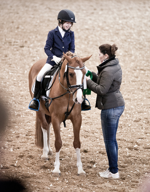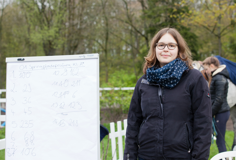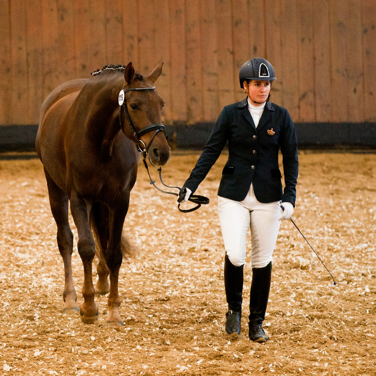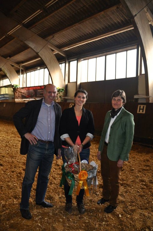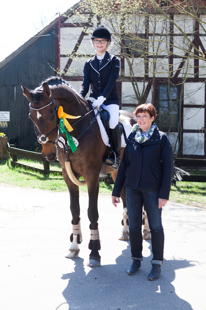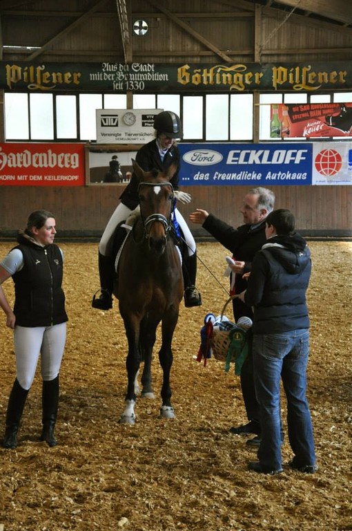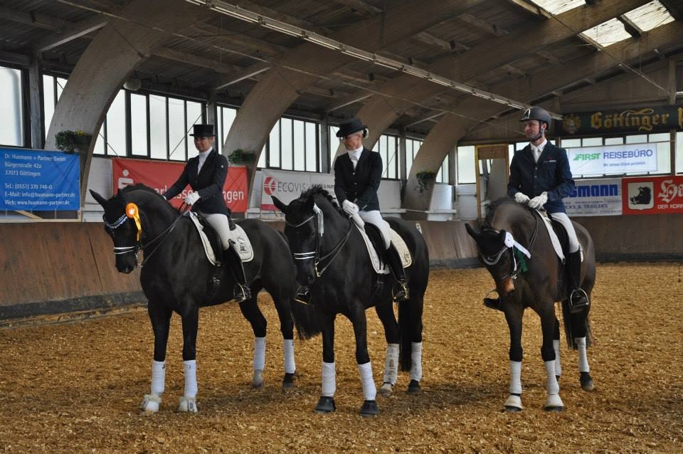 Sie erhielt 807,5 Punkte und übernahm damit die Führung. Die folgenden Ritte kamen bei weitem nicht an ihr Ergebnis heran. Erst als Lokalgröße Marion Loew vom RV Hof Bettenrode mit ihrem 16-jährigen Wallach Walk of Fame ins Prüfungsviereck ritt, wurde es noch einmal spannend. Am Ende reichte es jedoch nicht ganz: 791,5 Punkten bedeuteten für Marion Loew Platz 2 vor Charlotte Tollhopf mit Sarafina vom RFV Oberkaufungen. Carolin Miserre gab den ersten Platz im Verlauf der Prüfung nicht mehr ab und erhielt bei der Platzierung von Chef-Richterin Heidi Dörler ihre vierte goldene Schleife.
