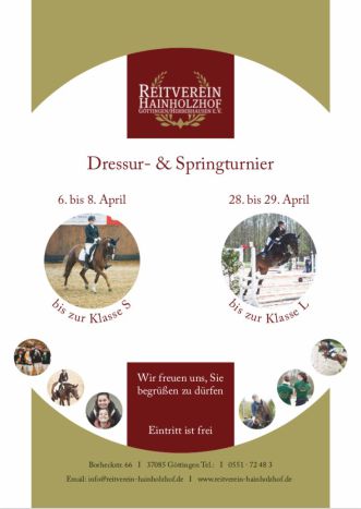 Wir haben lange über die Anfragen nachgedacht. Gemeinsam haben wir dann beschlossen, dass wir es noch einmal wagen werden: 2017 richtet der RV Hainholzhof wieder zwei Turniere aus. Wir beginnen mit unserem Dressurturnier bis zur Schweren Klasse vom 31. März bis 2. April. Nach Ostern läuten wir mit dem Springturnier bis zur Klasse L vom 22. bis 23. April die Platzsaison ein.